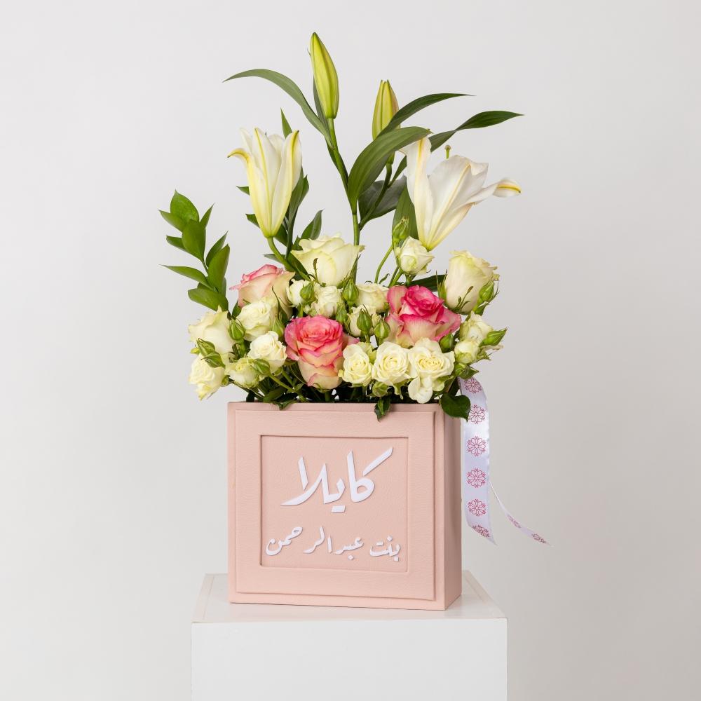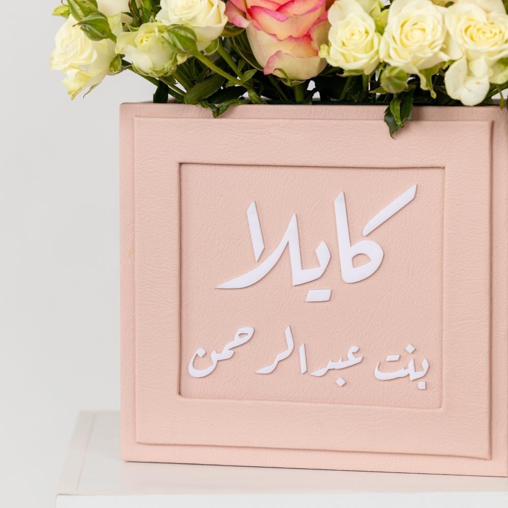 فازة ورد احمر المربعة لمولودك هي هدية رائعة ومميزة للاحتفال بوصول مولود جديد إلى العائلة.تتزين الفازة بالزهور الطبيعية مثل الجوري الأحمر والجوري الأبيض الطبيعي كما انها مصنوعة من الجلد . يمكنك أيضًا تخصيص الفازة بإضافة اسم المولود حسب الطلب.