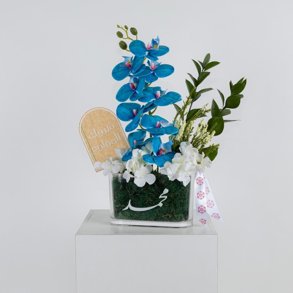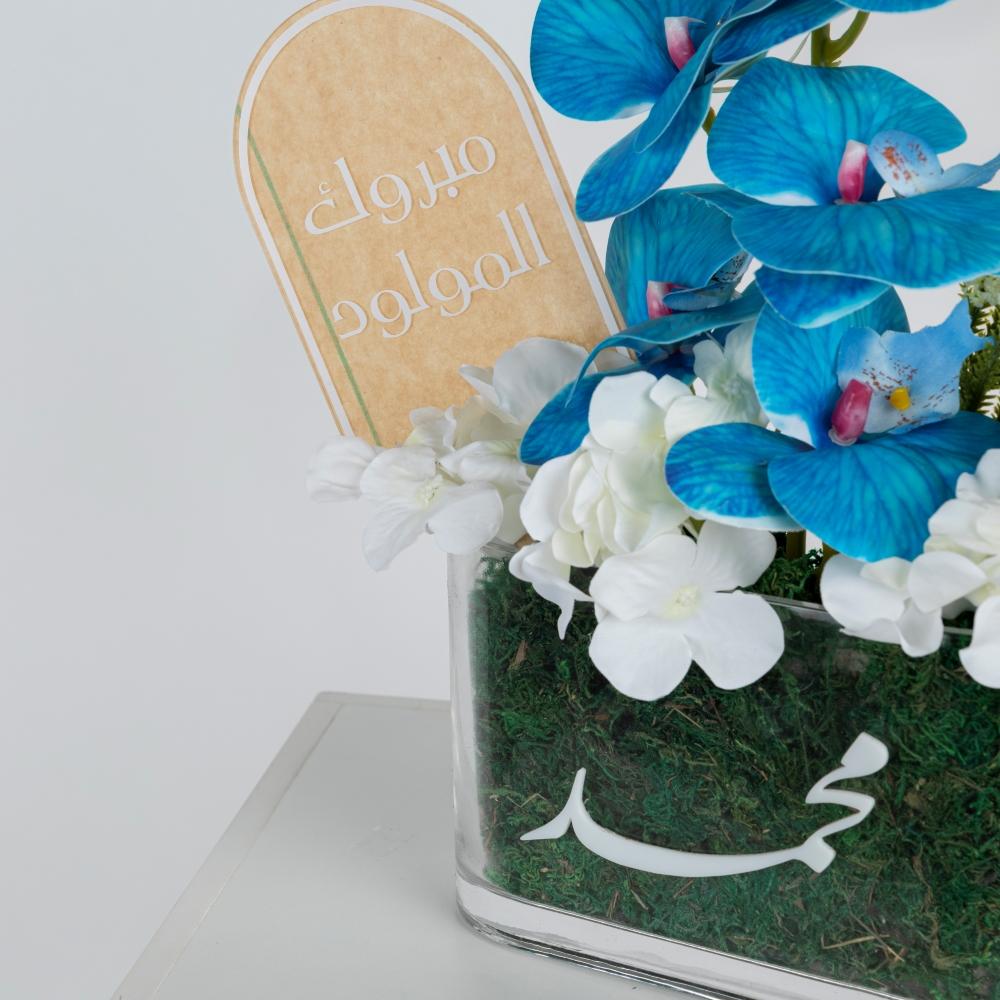 فازة زجاجة منسقة من الورود الصناعية مع تغريسة مبروك المولوديتم تغير الاسم حسب الطلبالرجاء كتابة الاسم بالملاحظات